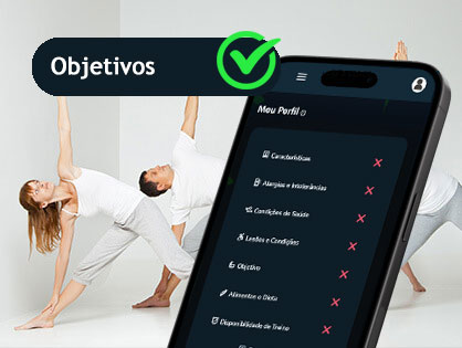Preencha seu perfil com poucos toques: Tempo disponível, fotos corporais, objetivos, intensidade, nível, preferências e histórico. Pronto, já temos tudo para personalizar sua jornada.